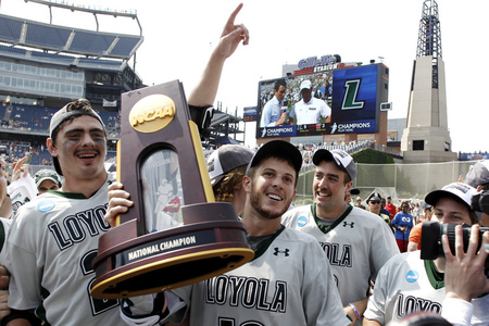 Making their first final round NCAA Men’s Lacrosse appearance since 1990, when current Coach Charley Toomey was the Hounds goalie, against the University of Maryland, Loyola set a number of NCAA records. After going down 3-2 early in the game, Loyola turned the tide shutting out Maryland for more than 40 minutes and scoring 7 unanswered goals. In the process, Eric Lusby broke the NCAA post-season record netting his 17th goal in the decisive crushing of the Terps, and set a school season record with 54 goals. Loyola, who started the season unranked, also tied the record for most wins in a season (18) with Duke, and is the smallest school to ever win the NCAA Division 1 title. If not for a pesky overtime goal by Johns Hopkins, Loyola would have finished the season undefeated and with the record of 19 wins. We’ll work on that for next year.