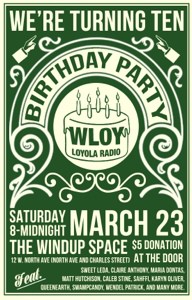 We’re turning ten! Our birthday is on March 19th – the day that marks ten years of 24/7 broadcasting – and we’re inviting EVERYONE to come celebrate with us! The birthday party is this Saturday, March 23rd, at the Windup Space on North Ave. Artists include: Wendel Patrick, Sahffi, Maria Dontas, Swampcandy, Matt Hutchison, Karyn Oliver, Sweet Leda, QueenEarth, Caleb Stine and Claire Anthony! The party starts at 8pm, with performances by our Late Night Concert guests. Bring your friends, and we’ll blow out the candles together!