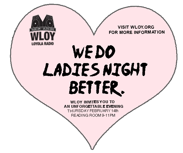 WLOY always treats its Valentines right, and how perfect is it that this year’s 14th falls on a Thursday? Get ready for a WLOY Valentine’s Day Extravaganza! From 9-11PM in the Reading Room, we’ll be providing a whole host of FREE goodies to show our love for our wonderful listeners, starting with free pizza courtesy of Loyola’s favorite Toss Pizzeria and ending with a gourmet sundae bar! Free food not enough? Entertainment will follow in the form of Loyola Musician and Heartthrob Peter Whitaker as well as a poetry reading from the Greyhound Poetry Collective. In true Late Night fashion, a raffle will also take place for both concert tickets and a special date — you must be present to win, and all proceeds will go to Relay for Life! Join us Thursday, February 14th — you don’t want to miss it!